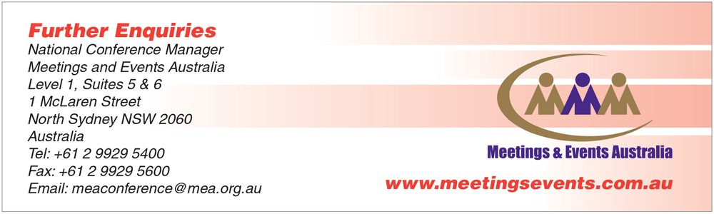 All registration fees are listed in Australian Dollars (AUD) and are inclusive of GST.  Payment for the registration is required at the end of the form, if you require an invoice prior to payment please do not complete the form and contact us at meaconference@mea.org.au for options.